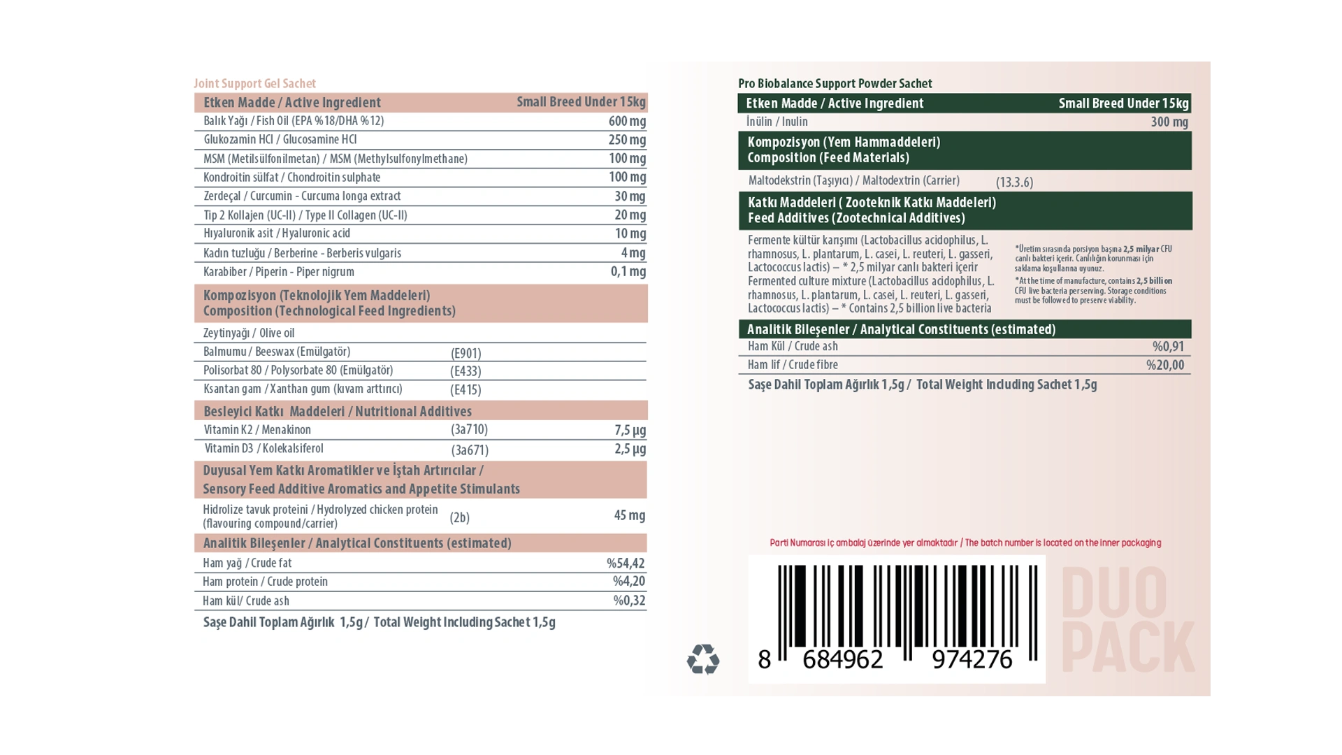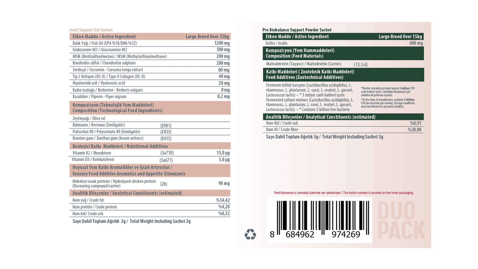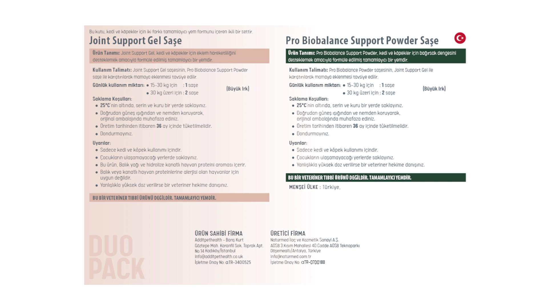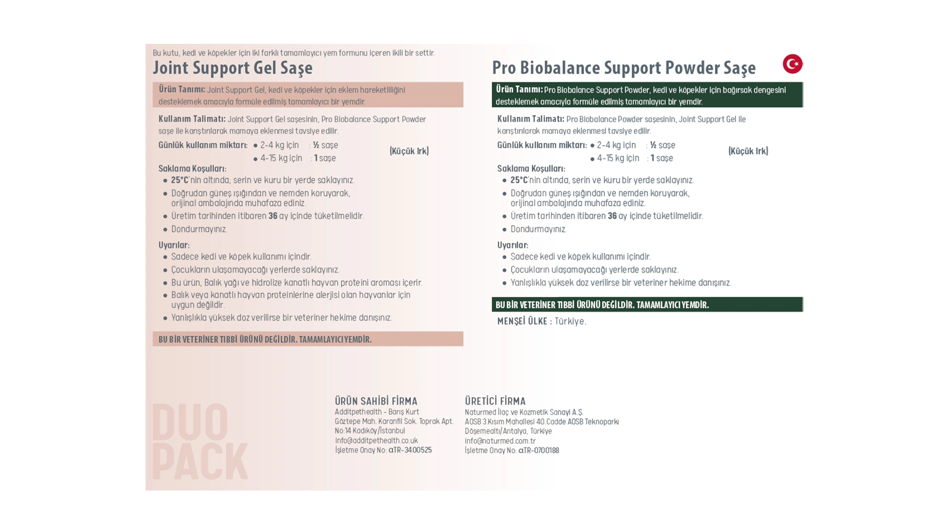 Sinerjik Etki: Jel formüldeki doğrudan eklem ve bağ doku desteği ile toz formüldeki mikrobiyota düzenleyici etki birlikte kullanıldığında; eklem dejenerasyonu, inflamasyon ve hareket kısıtlılığı döngüsü çok yönlü şekilde kırılır. Bu sayede yalnızca semptomların baskılanması değil, uzun vadeli koruma ve mobilite artışı sağlanır.